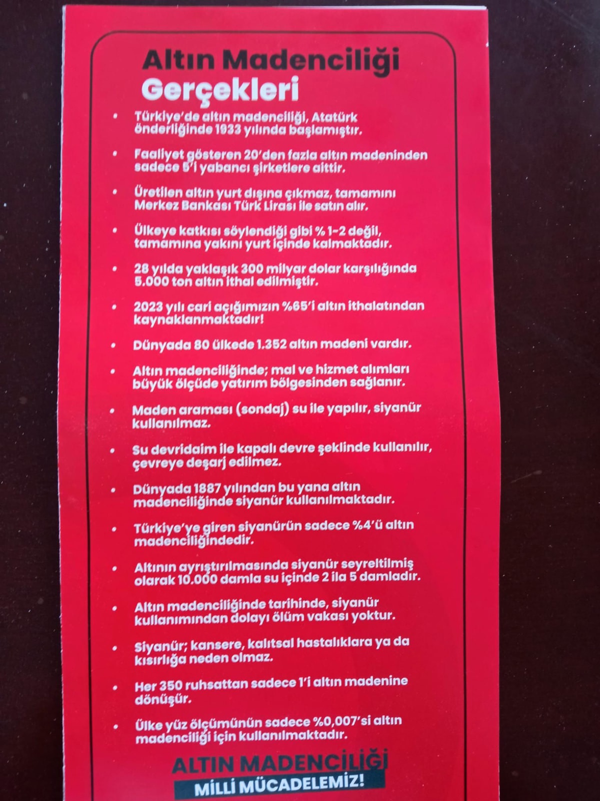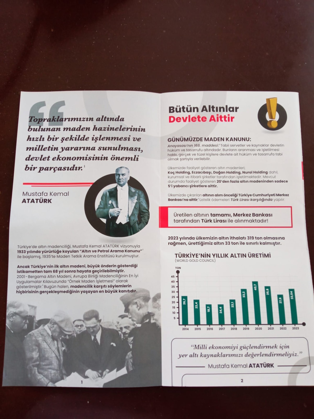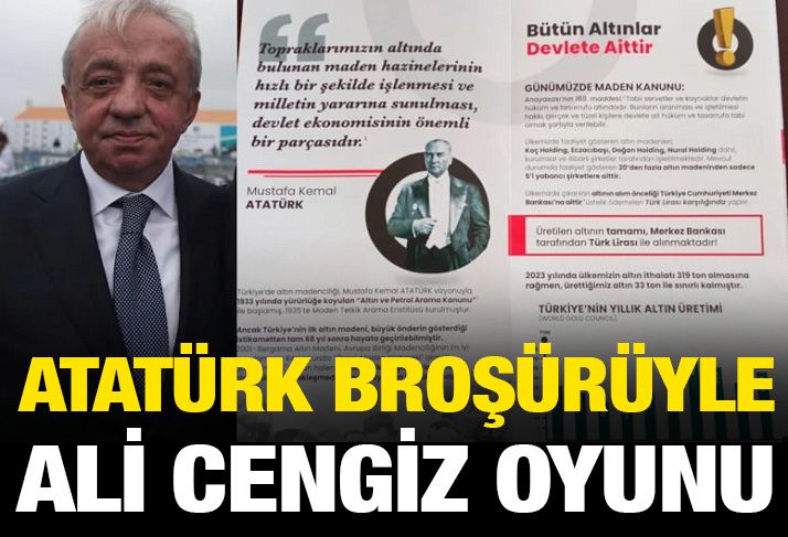 Cengiz’in bastırıp dağıttığı broşürde altın madenciliği ve siyanürlü işlemler savunuluyor. Atatürk’ün fotoğrafına da yer verilerek Ulu Önder’i milli politikaları istismar ediliyor. Broşürde şöyle deniliyor: