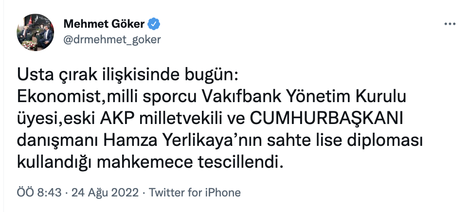 "Usta çırak ilişkisinde bugün: Ekonomist,milli sporcu Vakıfbank Yönetim Kurulu üyesi,eski AKP milletvekili ve cumhurbaşkanı danışmanı Hamza Yerlikaya’nın sahte lise diploması kullandığı mahkemece tescillendi."