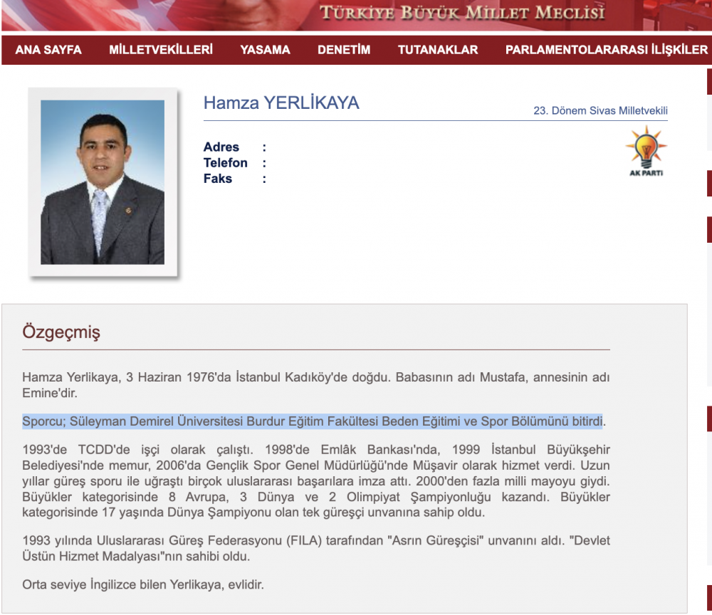 Yerlikaya'nın eğitim bilgileri konusunda AKP ve Türkiye Büyük Millet Meclisi'nin (TBMM) resmi internet siteleri arasında çelişkiler var.