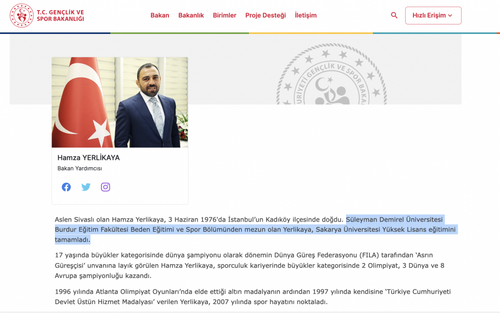 Gençlik ve Spor Bakanlığı'nın internet sitesine gelindiğindeyse işler ilerliyor ve Yerlikaya'nın 'yüksek lisans' yaptığı anlatılıyor:
