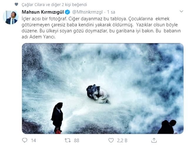 Sanatçı Mahsun Kırmızıgül, Hatay Valiliği’nin önünde “Çocuklarım aç, iş istiyorum anlamıyor musunuz!” dedikten sonra kendini yakarak yaşamına son veren Adem Yarıcı’nın ölümüyle ilgili sosyal medya hesabından ses getiren bir paylaşım yaptı.