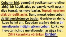 Yemeğini yedikten sonra eline aldığı bir küçük ağaç parçasıyla vakit geçsin diye toprağı eşmeye başlamıştır. Toprağı eşerken ufak bir delik açılır. Bunu merak eden çoban, deliği genişletmeye