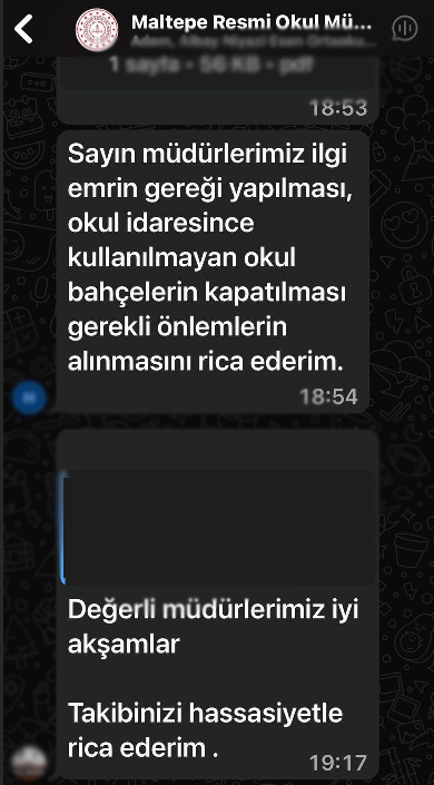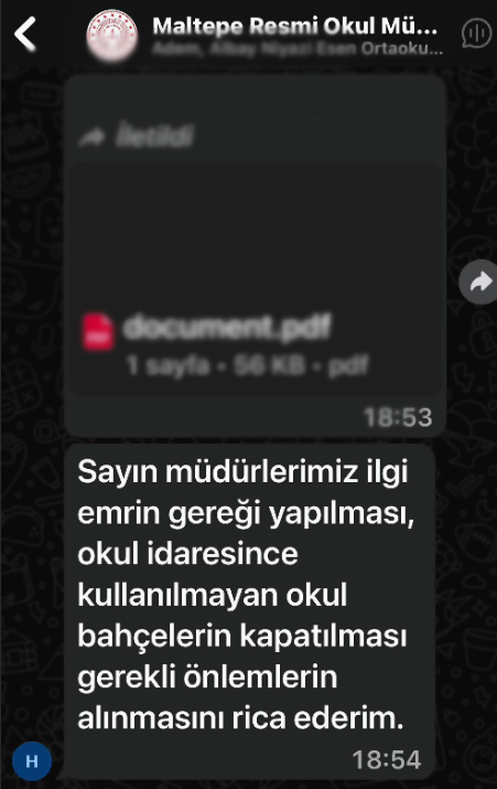 Tekin’in talimatı üzerine İstanbul başta olmak üzere il ve ilçe millî eğitim müdürlükleri WhatsApp gruplarından bakanın emrini paylaştı. Okul müdürlerine, “Kullanılmayan okul bahçelerinin kapatılması için gereğinin yapılması” diye emir verildi.