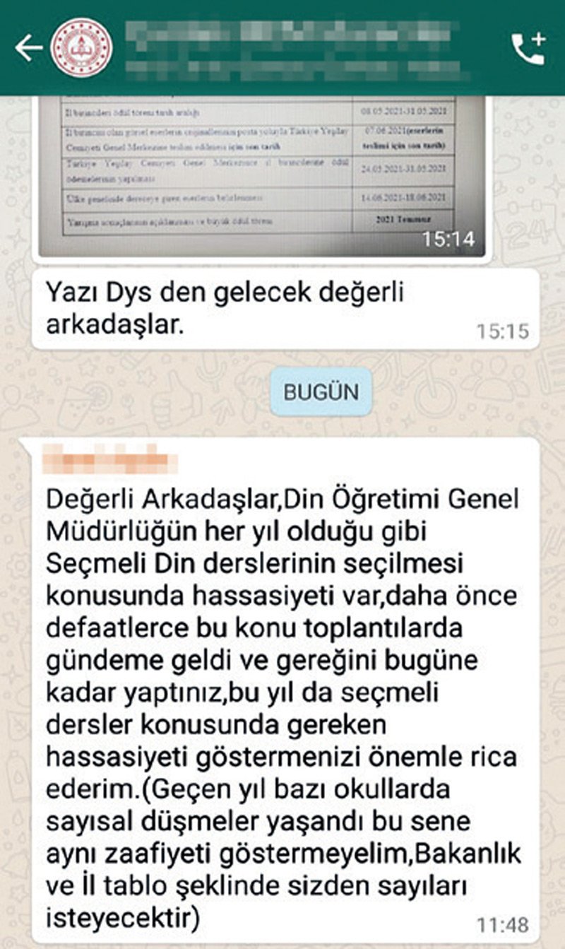 WhatsApp grubunda bir milli eğitim müdürü, “Bu üç dersin seçtirilmesi için gerekli çalışmaları yapalım. Derslerin seçilme oranlarında sorumluluk okul müdürlerinde, gerekli çalışmaların koordinesini yapalım” diyor.