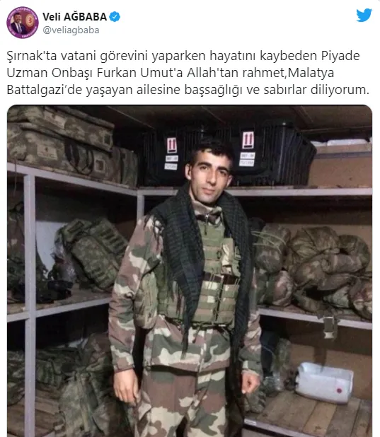 CHP Genel Başkan Yardımcısı Veli Ağababa sosyal medya hesabından katledilen asker için taziye mesajı yayınladı ancak 'şehit' diyemedi. Ağababa şu ifadeleri kullandı: "Şırnak'ta vatani görevini yaparken hayatını kaybeden Piyade Uzman Onbaşı Furkan Umut'a Allah'tan rahmet, Malatya Battalgazi'de yaşayan ailesine başsağlığı ve sabırlar diliyorum."