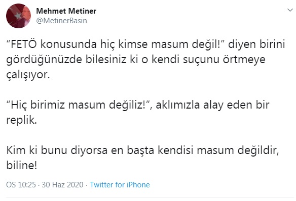AKP'li Mehmet Metiner, sosyal medya hesabından yaptığı açıklamada Arınç'ın "FETÖ konusunda hiç kimse masum değil!" sözlerine göndermede bulunarak isim vermeden Bülent Arınç'a yüklendi.