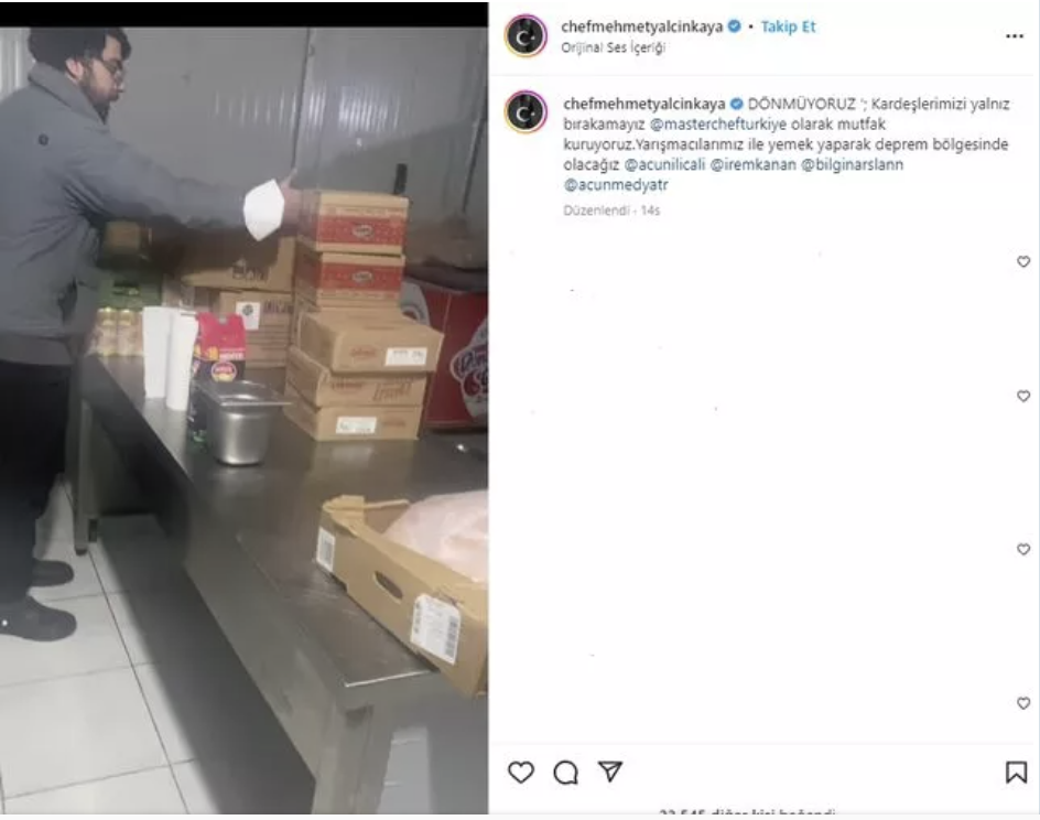 Yalçınkaya yaptığı paylaşıma şu sözleri not düştü: "Dönmüyoruz! Kardeşlerimizi yalnız bırakamayız. 'MasterChef Türkiye' olarak mutfak kuruyoruz. Yarışmacılarımız ile yemek yaparak deprem bölgesinde olacağız."