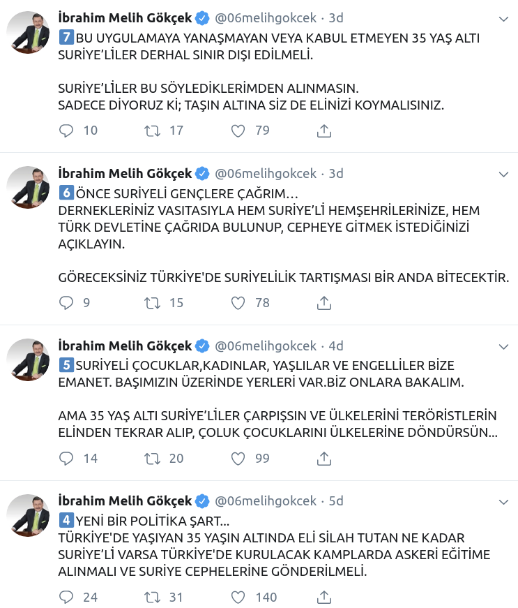 Ankara'nın eski Belediye Başkanı AKP'li Melih Gökçek, Türkiye'deki Suriyeli sığınmacılar hakkında skandal bir paylaşımda bulundu.