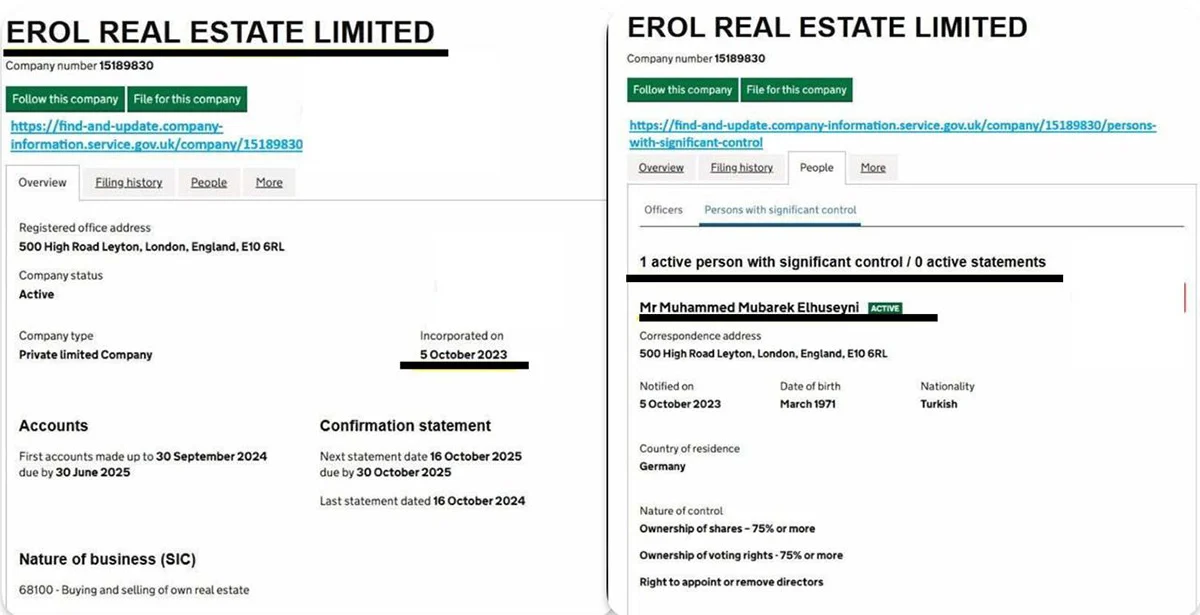 Mübarek Erol’un dergahları üzerine geçirmek amacıyla İngiltere’de göstermelik bir gayrimenkul şirketi açtığı da diğer iddialar arasında. Firmaların hukuki ve mali sorumluluklarını kaydedip denetleyen “Companies House”un resmi sitesinde yer alan bilgiye göre; Erol bu şirketi babasının vefatından yaklaşık üç ay sonra, 5 Ekim 2023’te kurdu. Bahsi geçen iki dergahın devir işlemleri de bu şirket üzerinden yapıldı.