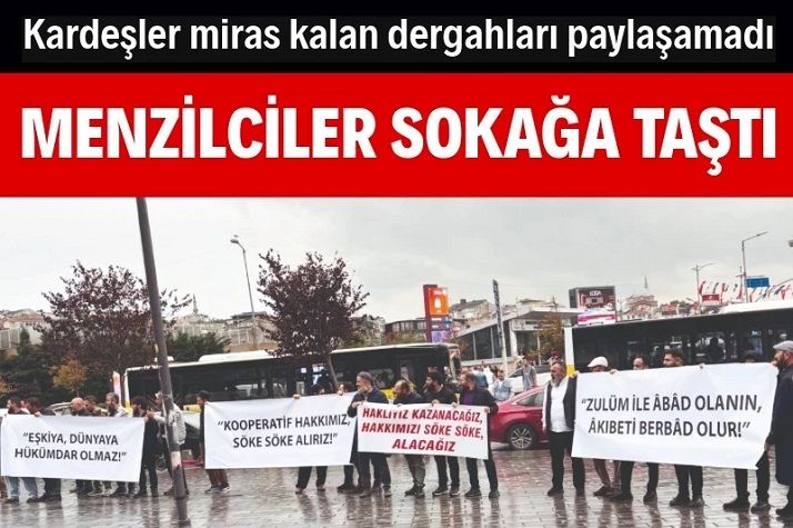 Menzilciler, diğer Menzilcileri protesto ederken, “Miras değil ümmetin emeği”, “Eşkıya dünyaya hükümdar olmaz!”, “Haklıyız kazanacağız, hakkımızı söke söke alacağız” pankartları açtılar.