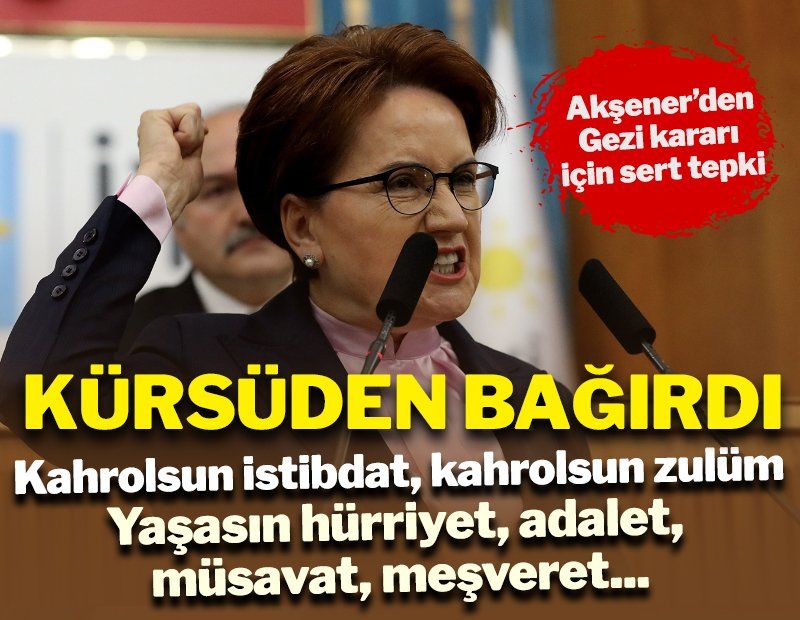 Gezi Parkı davasına değinen Akşener, “Her devirde, bizi bu hazineden mahrum etmek isteyecek, dahili ve harici bedhahlarımız olacak. Varsın olsun. Çünkü her devirde, bu vatanın; Bekçiliğini yapacak gençleri de olacak. Vahdeti'lerin karşısına dikilecek, Mustafa Kemal'leri de olacak. Topçu Kışlası hayallerine kapılanların karşısında, dimdik duran çapulcuları da olacak. İşte o nedenle buradan, bir kez daha ilan ediyorum: Parola vatan, işareti namus! Kahrolsun istibdat, kahrolsun zulüm! Yaşasın hürriyet, adalet, müsavat ve meşveret” ifadelerini kullandı.
