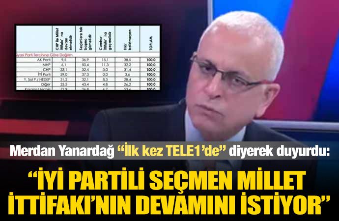 Cumhuriyet Halk Partisi (CHP) Genel Başkanı Özgür Özel’in İYİ Parti Genel Başkanı Meral Akşener’e yaptığı ‘iş birliği’ teklifini görüşmek için toplanan GİK toplantısında ‘hayır’ sonucu çıktı. İYİ Parti Sözcüsü Kürşad Zorlu kararı, “Genel idare kurulumuz 2024 yerel seçimlerine İYİ Parti’mizin hür ve müstakil olarak girme kararını almıştır” ifadeleriyle duyurdu. TELE1 Genel Yayın Yönetmeni Merdan Yanardağ, TELE1 ekranlarında yayınlanan ’18 Dakika’ programında “İlk kez TELE1’de” diyerek duyurduğu anketin sonuçlarını paylaştı. “Mart 2024 yerel seçimlerinde İYİ Parti sizce ne yapmalıdır?” sorusunun sorulduğu ankete göre, İYİ Parti seçmeninin yüzde 59’u “CHP ile Millet İttifakı’na devam etmelidir” diyor.