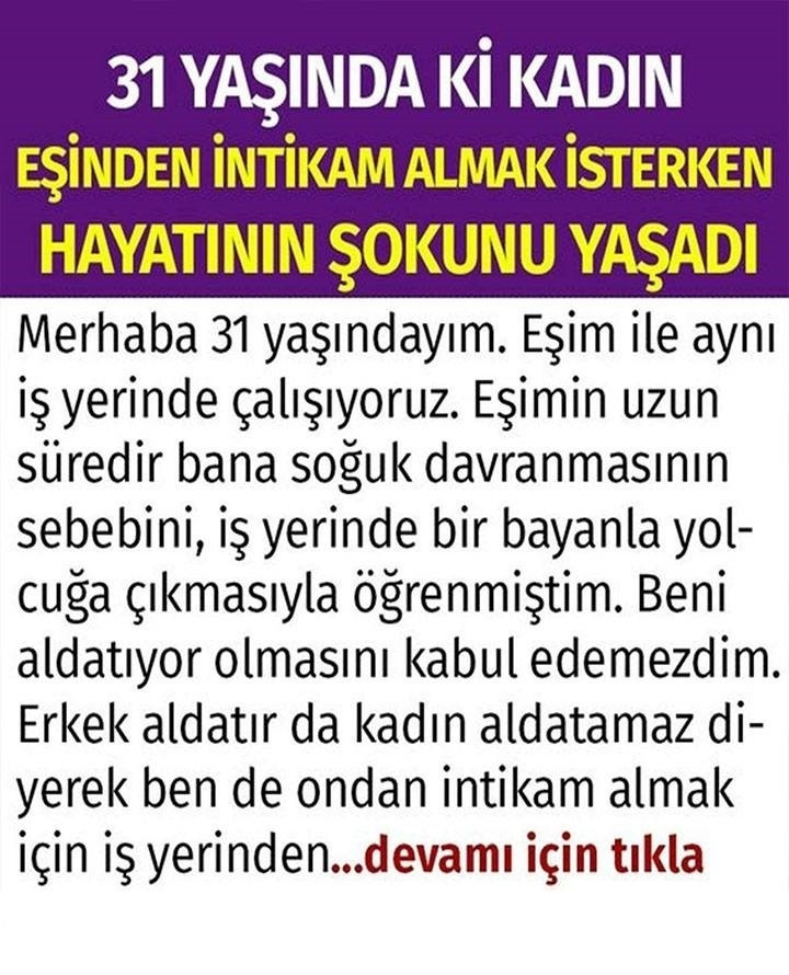 Merhaba Ben Ayla, 31 yaşında evli bir bayanım. Eşimle çalıştığım iş yerinde tanışmış, bir yıllık sevgililik sürecinden sonra isteyerek evlenmiştik. Eşim ailesinin rızası olmamasına rağmen benimle evlenmiş, bu nedenle de ailesi ile arası bozulmuştu. Ne kaynanam ne de diğer akrabalarımız evimize gelmezler, ara sıra sadece telefonla görüşürlerdi. Evliliğimizin ilk yılları çok güzeldi, eşimle beraber işe gider, yine beraber evimize dönerdik. Anlayacağınız günün neredeyse 24 saati aslında beraberdik. Bu beraberlik bize ilk başlarda güzel gelmiş olsa da aslında zamanla aramızda ki heyecanı ve eşler arasında olması gereken özlemi de bitirmişti. Evliliğimizin dördüncü yılına girmiştik, ben bazı heyecanlar oluşturmak istesem de eşimden aynı seviyede geri dönüş alamadığım için sürüklemekte zorluk çekiyordum. Her ikimizin de çalışıyor olması nedeniyle ekonomik hiçbir sorunumuz yoktu. Ama maalesef ki para her şeyi çözmüyordu. Severek evlendiğim, benim için ailesini bile karşısına alan adamla aramıza her gün bir duvar daha örülüyordu. Benim fark ettiğim bu duvarları, onun da fark ettiğinden emindim. Esas beni rahatsız eden mesele de onun bu evliliği kurtarmak için hiçbir şey yapmıyor olmasıydı. Eşimin her gün biraz daha uzaklaşması aklıma acaba benden başka birisi mi var sorusunu getirmişti. Sonuçta iş yerinde de evde de birlikteydik, ayrı kaldığımız vakit yok denecek kadar azdı, ama bu olamayacağı anlamına da gelmezdi. Hayatında benden başka birisi yoksa neden benden uzak duruyordu ki? O gün sabah eşimle birlikte evden çıktık, iş yerine kadar aynı arabada hiç konuşmadan gittik. İşe vardığımızda herkes kendi birimine geçti, biraz sonra yanıma bizim birimin sekreteri olan hülya hanım geldi ve eşimin yaptığıyla alakalı bilgimin olup olmadığını sordu. Ben de hayırdır ne oldu dediğim de duyduklarım sonrası şok olmuştum.