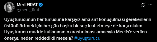 Tanınmış isimlerin serbest bırakılmasının ardından sosyal medya hesabından açıklama yapan oyuncu Mert Fırat, "Uyuşturucunun her türlüsüne karşıyız ama sırf konuşulması gerekenlerin üstünü örtmek için her gün başka bir suç icat etmeye de karşı olalım… Uyuşturucu madde kullanımının araştırılması amacıyla Meclis'e verilen önerge, neden reddedildi mesela?" dedi.