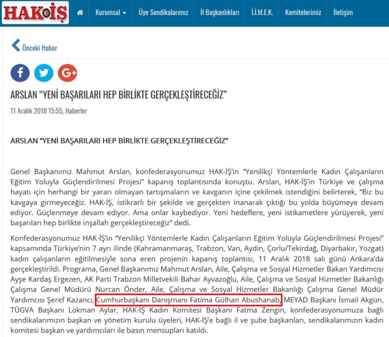 AKP’ye yakınlığıyla bilinen Hakİş’in “Yenilikçi Yöntemlerle Kadın Çalışanların Eğitim Yoluyla Güçlendirilmesi Projesi”nin kapanışına katılan Fatma Gülham Abushanab, Cumhurbaşkanlığı danışmanı olarak anons edildi.