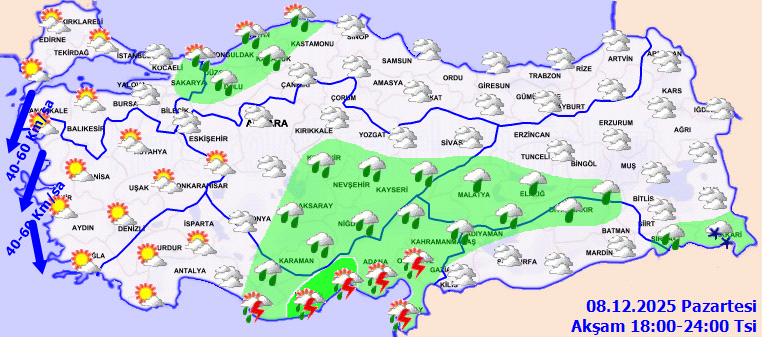 Genellikle yurdun batı kesimlerinde kuzeyli, doğusunda güneyli yönlerden hafif, ara sıra orta kuvvette, Marmara'nın kuzeyi ile Batı Karadeniz ve Ege kıyılarında kuzeyli yönlerden kuvvetli (40-60 km/saat) eseceği tahmin ediliyor.