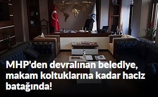 Alacağını tahsil etmek isteyen firmanın avukatları haciz memurlarıyla birlikte Pazartesi günü belediyeye gelerek başkanlık makamı ve birim müdürlerinin odalarındaki mobilyaları toplayıp götürecek. Götürülecek mobilyalar arasında belediye başkanı makam koltuğu da bulunuyor.