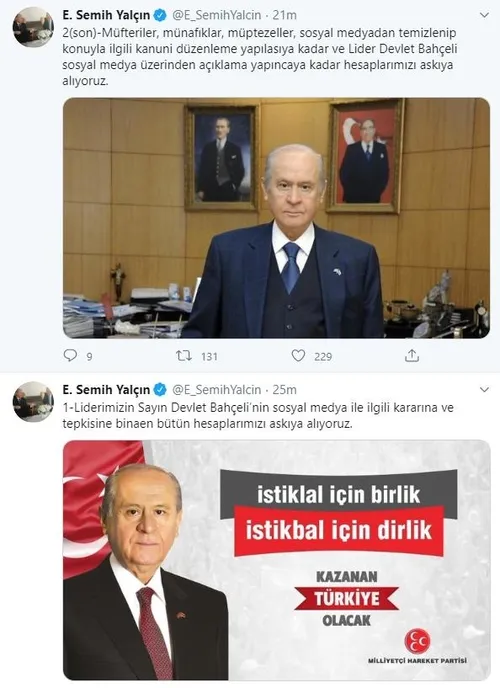 MHP Genel Başkanı Devlet Bahçeli, bugün son Twitter mesajlarını paylaştığını belirterek, "Sosyal medyada yaşanan dehşet verici ve şiddet dolu kirlenme nihayete ermeden bir daha ne Twitter hesabımı kullanacağım ne de Facebook paylaşımı yapacağım. Bu konuda TBMM'de gündeme gelecek her muhterem ve müstesna kanun teklifine de sonuna kadar destek vereceğim" dedi.