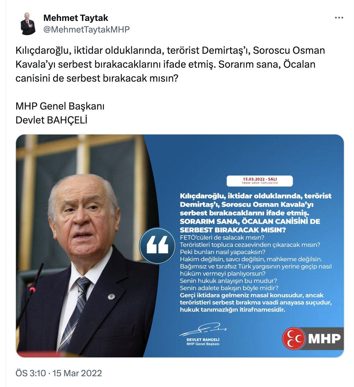 “Kılıçdaroğlu, iktidar olduklarında, terörist Demirtaş’ı, Soruscu Osman Kavala’yı serbest bırakacaklarını ifade etmiş. Sorarım sana, Öcalan canisini de serbest bırakacak mısın?”