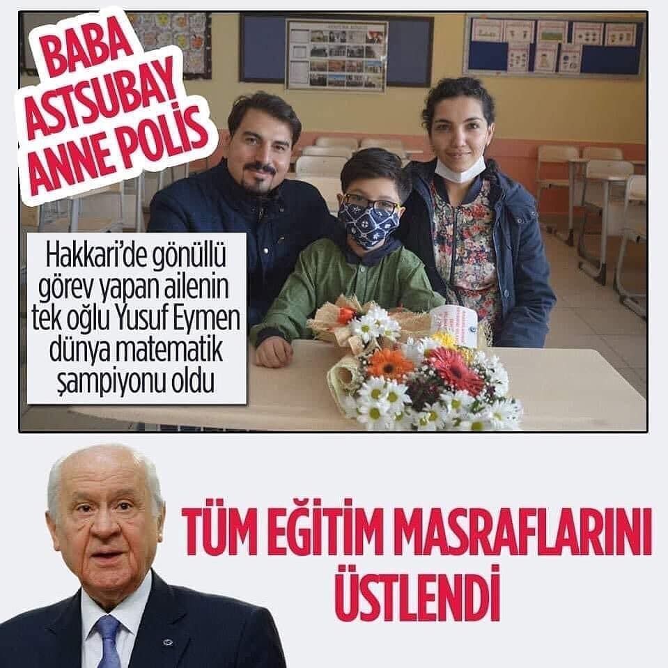 Yusuf Eymen'in başarısı kadar önemli diğer hususun, anne ve babasının şark görevini gönüllü uzatmaları ve bu gururlandıran başarının devlet okulundan çıkması olduğunu belirten Bahçeli, şunları kaydetti: