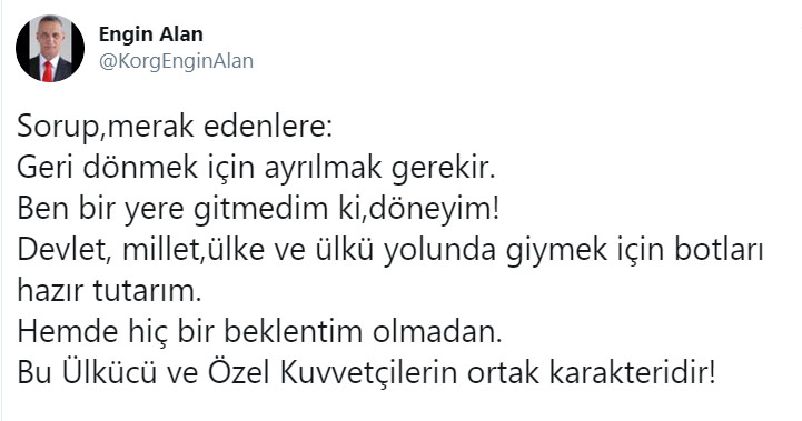 Engin Alan, Twitter’da “Sorup, merak edenlere: Geri dönmek için ayrılmak gerekir. Ben bir yere gitmedim ki, döneyim!Devlet, millet, ülke ve ülkü yolunda giymek için botları hazır tutarım.