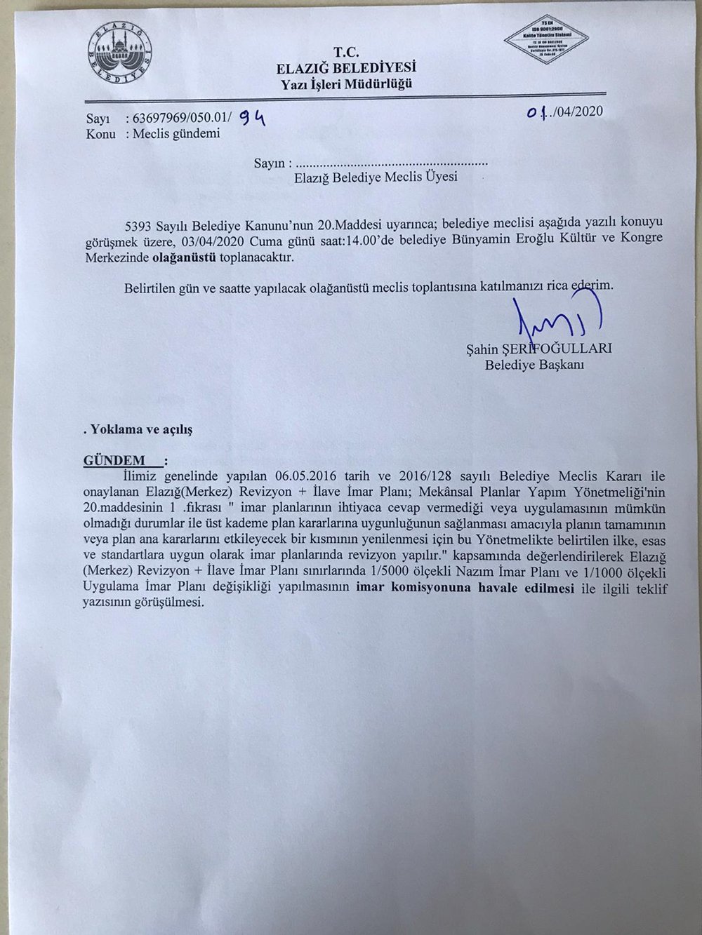 Sözcü Gazetesi'nden Evren Demirdaş'ın haberine göre; AKP’li Elazığ Belediye Başkanı Şahin Şerifoğulları, İçişleri Bakanlığı’nın belediyelerin Nisan, Mayıs ve Haziran aylarında meclis toplantıları ertelemesine rağmen imar değişikliği gündemiyle 3 Nisan 2020 Cuma günü Belediye Meclisini ‘olağanüstü' toplantıya çağırdı.