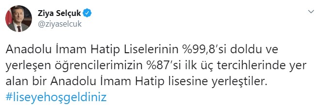 Twitter’dan açıklama yapan Bakan Selçuk, İmam Hatip Liselerinin yüzde 99,8’inin dolduğunu belirtti.
