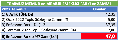 TÜİK verilerine göre, haziran ayında enflasyon yüzde 4,95 artarken, yıllık bazda 78,62 seviyesine yükseldi. Buna göre, temmuzdan geçerli olmak üzere kamu görevlileri ile memur emeklilerinin tamamının aylık ve ücretlerinde yüzde 7 artış öngörülmüştü. Bu yılın birinci 6 aylık döneminde enflasyon yüzde 42,35 oldu. Gerçekleşen bu enflasyon oranından kaynaklı olarak ilave yüzde 34,69 artışla birlikte kamu görevlileri ile memur emeklilerinin aylık ve ücretlerinde bu aydan geçerli olmak üzere toplamda yüzde 41,69 artış yapıldı.