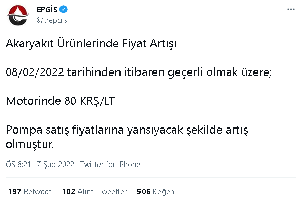 Enerji Petrol Gaz İkmal İstasyonları İşveren Sendikasından (EPGİS) yaptığı resmi açıklamada, "Akaryakıt Ürünlerinde Fiyat Artışı 08/02/2022 tarihinden itibaren geçerli olmak üzere; Motorinde 80 KRŞ/LT Pompa satış fiyatlarına yansıyacak şekilde artış olmuştur." denildi.