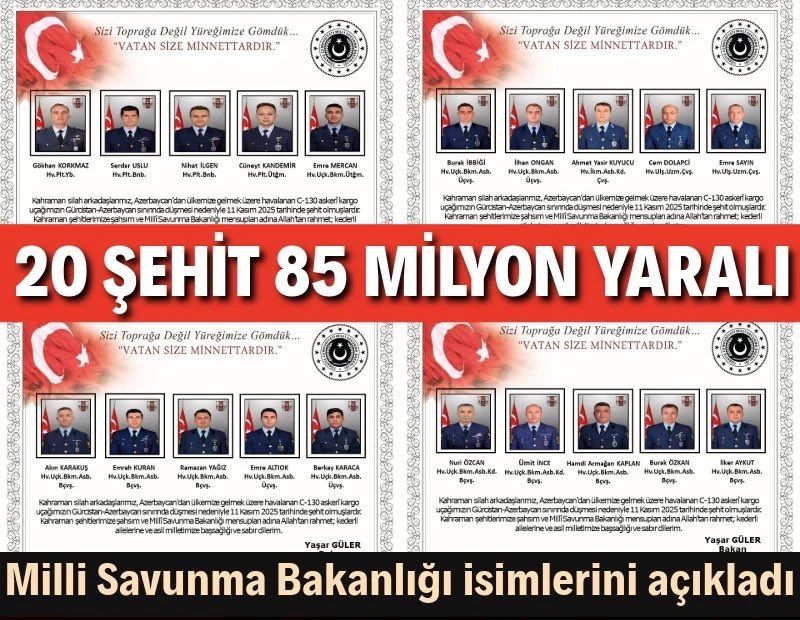 Milli Savunma Bakanlığı bu sabah, şehit olan 20 personelin isimlerini açıkladı: