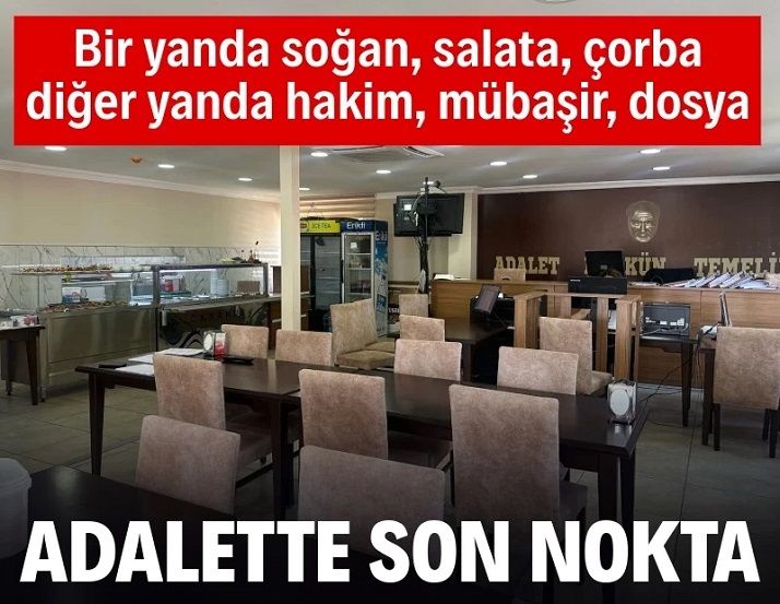 Yemek masaları, salatalar ve ekmeklerin bulunduğu yemekhane içinde oluşturulan duruşma salonunda görülen davalar hukukçular içinde tartışma konusu oldu.