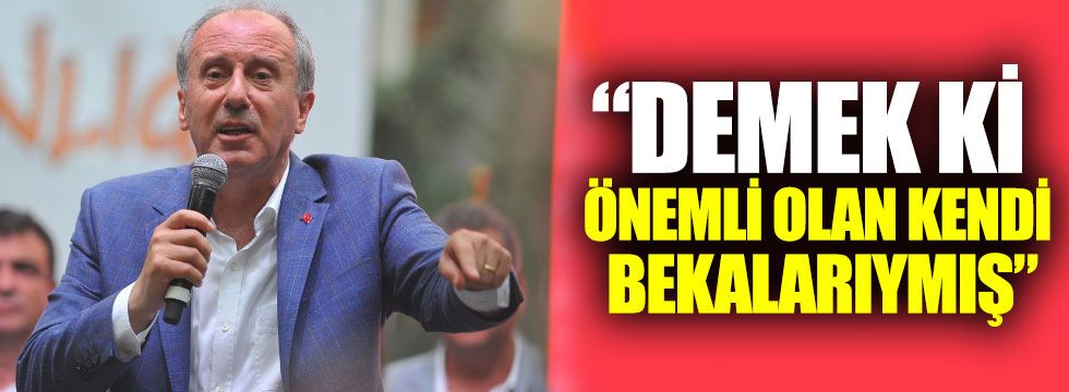 Cumhurbaşkanı Recep Tayyip Erdoğan ve MHP Genel Başkanı Devlet Bahçeli’nin seçimler öncesi yaptığı ‘Beka’ açıklamalarını da hatırlatan İnce, “Seçim bitti, 11 gün geçti BEKA diyen yok. Demek ki neymiş önemli olan milletin bekası değil kendi bekalarıymış” ifadelerini kullandı.