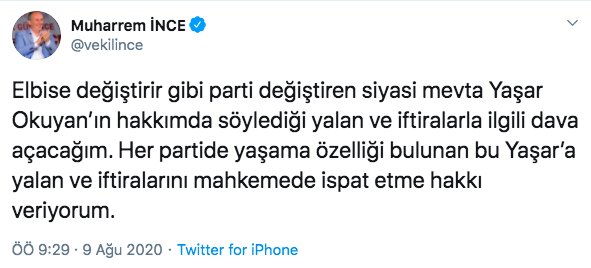 Muharrem İnce, sosyal medya hesabından yaptığı açıklamada, Yaşar Okuyan’a çok sert tepki gösterdi. İnce " Elbise değiştirir gibi parti değiştiren siyasi mevta Yaşar Okuyan’ın hakkımda söylediği yalan ve iftiralarla ilgili dava açacağım. Her partide yaşama özelliği bulunan bu Yaşar’a yalan ve iftiralarını mahkemede ispat etme hakkı veriyorum." ifadelerini kullandı.