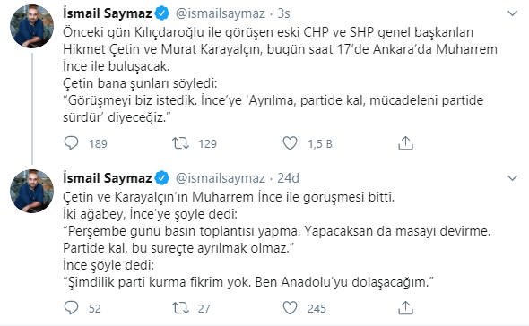 Gazeteci İsmail Saymaz; Çetin, Karayalçın ve İnce'nin görüşmesine ilişkin detayları paylaştı.
