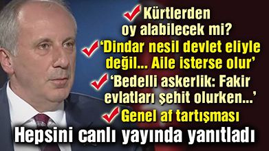 Fenerbahçe’deki son kongreyle yaşanan değişime de değinen İnce, “Değişim rüzgarı gelince önünde duramazsın. Ben Fenerbahçeliyim. Kongre delegesiyim ama oy kullanmaya gitmedim. Bir değişimin önünden gidenler lider olur, ortasından gidenler durumu kavramış olur, arkasından gidenler sürüklenmiş olur, karşısına çıkanlar yok olur. Zaten sosyal medyada görüyorsunuz siyasetle bir benzetme yapıyorlar, doğru da yapıyorlar. Ben siyasette de bu değişimi görüyorum. Buna direnmemek lazım. Erdoğan ömür boyu mı kalacak orada? Seçim yapmayalım o zaman ömür boyu kalsın orada Türkmen başı gibi olsun. Çırpınmaya gerek yok. Alacaksın emekli maaşını çekileceksin kenara torunlarına bakacaksın. Yoruldun. Rövanş intikam böyle bir derdimiz yok. Hukuk devletini kuracağız, özgürleştireceğiz Türkiye'yi, zenginleştireceğiz. Bağırmayacağız. Hesap veren yönetim olacak. Öyle bir anlatıyor ki o gidince din elden gidiyor. Erdoğan'dan önce Müslüman değil miydik biz?” dedi.