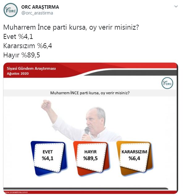 ORC Araştırma Şirketi’nin yaptığı son anketten yeni parti iddialarıyla gündeme gelen Muharrem İnce’ye büyük şok çıktı. Muharrem İnce parti kursa, oy verir misiniz?" sorusunu yanıtlayan vatandaşların yüzde 89,5’i “Hayır” yanıtını verirken, “Evet” diyenlerin oranı ise yüzde 4,1’de kaldı.
