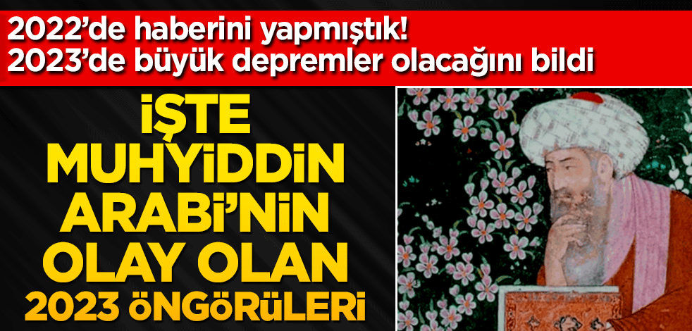 2022 yılında haberini yaptığımız Muhyiddin Arabi’nin 2023 öngörülerinde Türkiye büyük depremini yazmıştık. Arabi’nin bu öngörüsü tutması üzerine 2023 yılında olacak diğer olayları herkes merak eder oldu. İşte ünlü düşünür Muhyiddin Arabi’nin diğer öngörüleri…