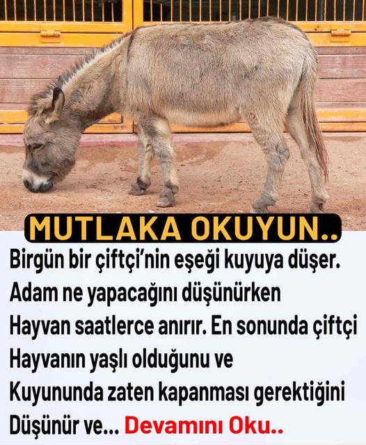 Muhteşem bir olay; Günlerden bir gün, köylerden birinde...bir adamın eşeği kör kuyulardan birinin içine düşmüş. Niye düşer, nasıl düşer diye sormayın. Eşek bu, düşmüş işte. Hayvancık saatlerce acı içinde kıvranmış, anırmış, sesini duyurmaya çalışmış....Derken eşeğin sahibi gelmiş kuyunun başına. Bakmış zavallı eşek kuyunun dibinde melül mahzun bakınıyor. Üstelik de yaralı. Bir hal çaresi düşünürken bir koşu gidip köylüleri yardıma çağırmak gelmiş aklına.