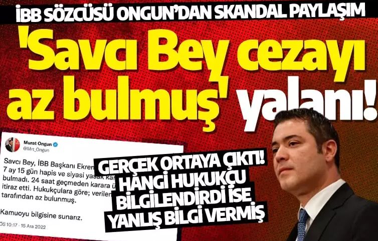 Ongun, yaptığı paylaşımında, "Savcı Bey, İBB Başkanı Ekrem İmamoğlu’na verilen 2 yıl 7 ay 15 gün hapis ve siyasi yasak kararını yeterli bulmadı. 24 saat geçmeden karara üst mahkemede itiraz etti. Hukukçulara göre; verilen ceza Savcı Bey tarafından az bulunmuş. Kamuoyu bilgisine sunarız." diyerek büyük bir skandala imza attı.