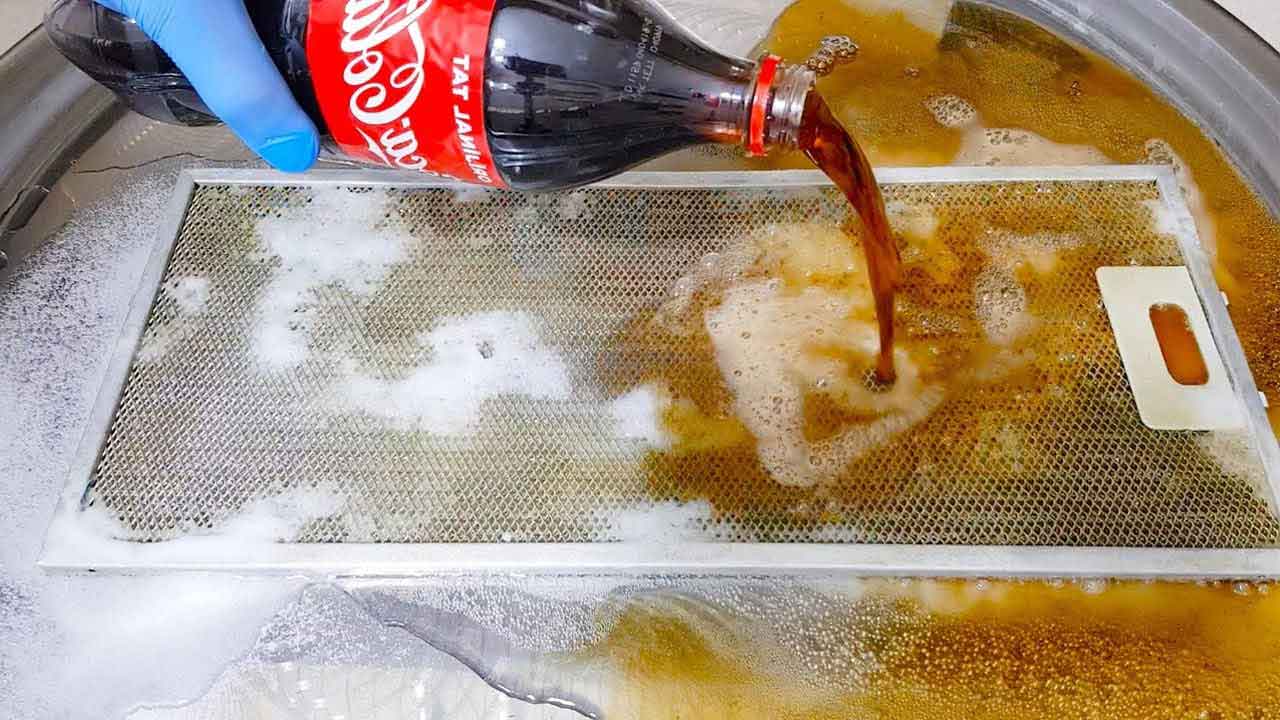 Filtreyi aspiratörden çıkarın ve derin bir fırın tepsisine koyun. Koku filtrenin üzerine dökün ve tamamen batırıldığından emin olun. Filtreyi 20 dakika boyunca kola döküp bekletin. Daha sonra, filtreyi kaba bir fırça ile ovalayın. Her şey yolunda giderse, artık filtrenin tüm kirlerini kolayca temizleyebilirsiniz. Son olarak, filtreyi ılık suyla durulayın..