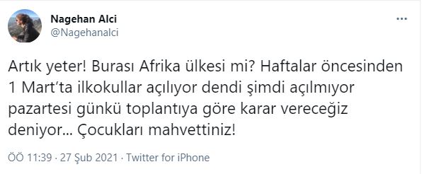 AKP iktidarına yakın gazeteci Nagehan Alçı, okulların açılması ile ilgili net bir karar verilmemesinin çocukları olumsuz etkilediğine dikkat çekerek, eleştirdi. Alçı, "Artık yeter! Burası Afrika ülkesi mi?