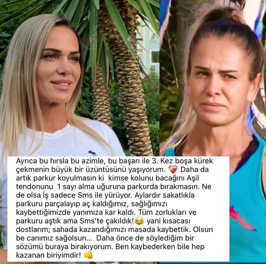 Selam Dostlar… Bu yolda benimle birlikte olan, duasını ve desteklerini esirgemeyen, beni yalnız bırakmayan, yanımda olan ve geldikten sonra merak edip beni arayan, yazan ve güzel mesajlarla bana manevi mutluluğu yaşatan tüm sevenlerime destekçilerime teşekkür ediyorum. Bu serüven sırasında çok şey öğrendim. Survivor gibi rekabetin ve hırsın ön planda olduğu yerde başarı ipini göğüslemek ve zoru başarmak çok çok zor .Her yarışmacının daha doğrusu herkesin harcı değildi.Ben bunu tek başıma başardığıma inanıyorum. Hele ki herkesin birbirinin ayağını kaydırmak için can attığı bu Allstar'da başarılı olmak belki de en zor şeylerden biriydi. Bu serüvende pek çok olaylar yaşadık , gördükleriniz ve göremedikleriniz ..Yaptığım hiçbir şeyden pişman olmadım, olmayacak bir hayalin peşinde kızımı üç kez bırakmak dışında…