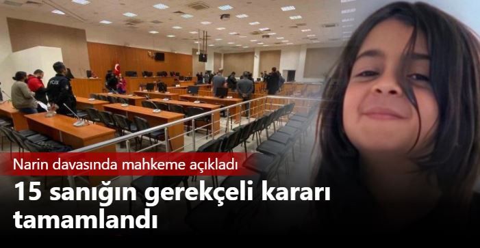Diyarbakır'ın Merkez Bağlar ilçesine bağlı kırsal Tavşantepe mahallesinde 21 Ağustos 2024 günü kaybolmasının ardından cansız bedeni 19 gün sonra 8 Eylül'de Eğertutmaz Deresi’nde cesedi bulunan 8 yaşındaki Narin Güran cinayetine ilişkin Diyarbakır Cumhuriyet Başsavcılığı’nca başlatılan ikinci davanın soruşturma sonucu 6'sı tutuklu, 3'ü suça sürüklenen çocuk olmak üzere 15 kişinin ceza aldığı davaya yönelik Diyarbakır 17. Asliye Ceza Mahkemesi tarafından gerekçeli kararın yazımı tamamlandı.