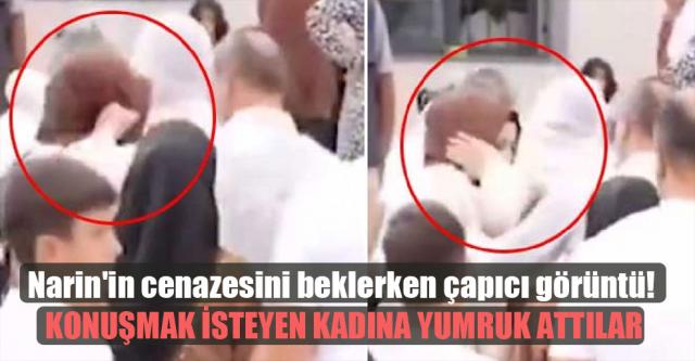 Diyarbakır’da cansız bedeni bulunan Narin’in akrabası olduğu belirtilen bir kadın, cenaze salonunun önünde “Gidin yalan konuşun, tamam mı?” şeklinde bağırdı. Bu sırada kadına yanındaki biri yumruk atarak susmasını sağladı ve bu anlar cep telefonu kamerasınca görüntülendi.