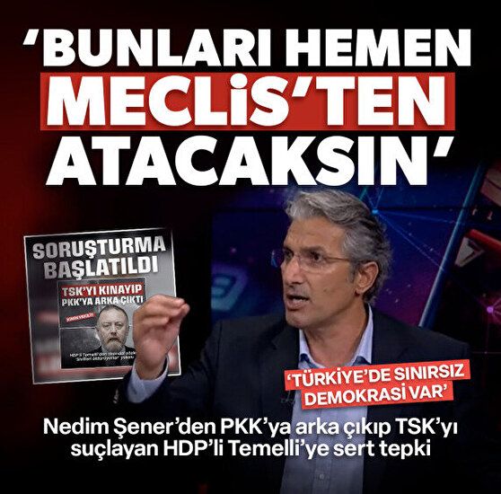 Gazeteci Nedim Şener, Türk ordusunun Suriye ve Irak'ın kuzeyindeki terör örgütü hedeflerine yönelik başlattığı hava harekatlarına karşı çıkan HDP'li Sezai Temelli'nin açıklamalarına sert tepki gösterdi. Temelli'nin HDP'nin paravan partisi YSP'nin vekili olduğunu hatırlatan Şener, siyasi partiler kanunundaki maddeye işaret edip, "PKK, 2012'de HDP ile beraber YSP'yi de kurmuş. Siyasi partiler kanununa göre öyle bir madde koyulmalı ki, Temelli örneği üzerinden HDP ve YSP kapatılmalı" diye konuştu. Türkiye'de sınırsız demokrasi olduğunu söyleyen Şener, "Artık beklemeyeceksin ek dilekçeyle pazartesi günü kapatacaksın. Hepsini Meclis'ten atacaksın dışarıya." dedi. Türk Silahlı Kuvvetleri'nin (TSK) Suriye ve Irak'ın kuzeyinde yer alan terör unsurlarına düzenlediği hava harekatı HDP vekili Sezai Temelli'yi rahatsız etmişti. Terör örgütü PKK'nın kanalına çıkan Temelli, TSK'nın sivilleri öldürdüğü yalanını ortaya atıp, operasyonu kınamıştı. Ankara Cumhuriyet Başsavcılığı Temelli hakkında, Türk Ceza Kanunu'nun 301. maddesi kapsamında re'sen soruşturma başlattı.