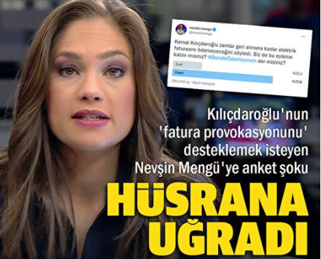 Gazeteci Nevşin Mengü'nün sosyal medyada yaptığı ankette "Kemal Kılıçdaroğlu zamlar geri alınana kadar elektrik faturasını ödemeyeceğini söyledi. Siz de bu eyleme katılır mısınız?#Bende Ödemiyorum der misiniz?" sorusu soruldu.