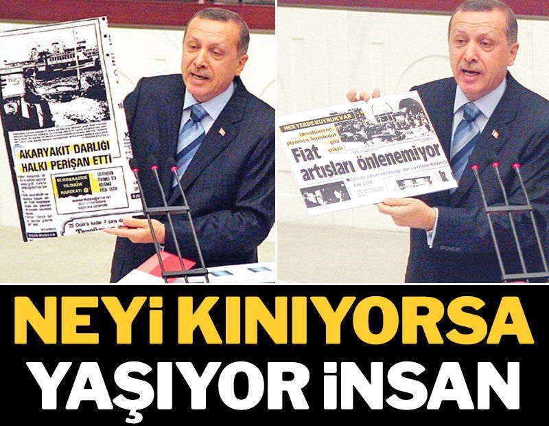16 Aralık 2008 günü TBMM'deki bütçe görüşmelerinde söz alan Erdoğan, büyük kartonlar üzerine yapıştırılmış gazete kupürlerini ve geçmiş iktidarlar dönemindeki zam haberlerini göstermişti. Erdoğan o günkü konuşmasında, bugün de sık sık benzerleriyle karşılaşılan zamlardan örnekler verdi, manşet olan zam haberlerini sıraladı. İşte Erdoğan'ın 14 yıl önceki konuşmasından satır başları: