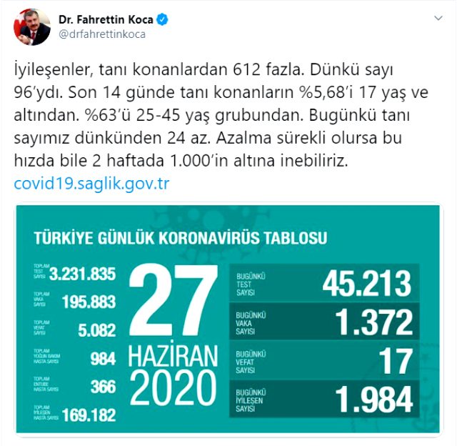 Sağlık Bakanı Fahrettin Koca, Türkiye’deki koronavirüs salgınıyla ilgili 27 Haziran verilerini açıklarken son 14 günde tanı konan hastaların yüzde 63’ünün 25-45 yaş grubundan olduğunu söyledi. Bu yaş grubunun salgın sürecinde hiçbir kısıtlamaya tabi olmayan ve yaz tatilinin başlamasıyla daha rahat davranan yaş grubu olması dikkatlerden kaçmadı. Türkiye’deki koronavirüs salgını sürecinde 27 Haziran verilerini açıklayan Sağlık Bakanı Fahrettin Koca, son 14 günde tanı konan hastaların yaş gruplarını da paylaştı. Bakan Koca’nın paylaştığı verilerde salgının başından beri hiçbir kısıtlamaya tabi olmayan ve ekonomik özgürlüğünü elinde bulunduran 25-45 yaş grubunun hastalığa yakalanma oranındaki fazlalık göze çarptı.