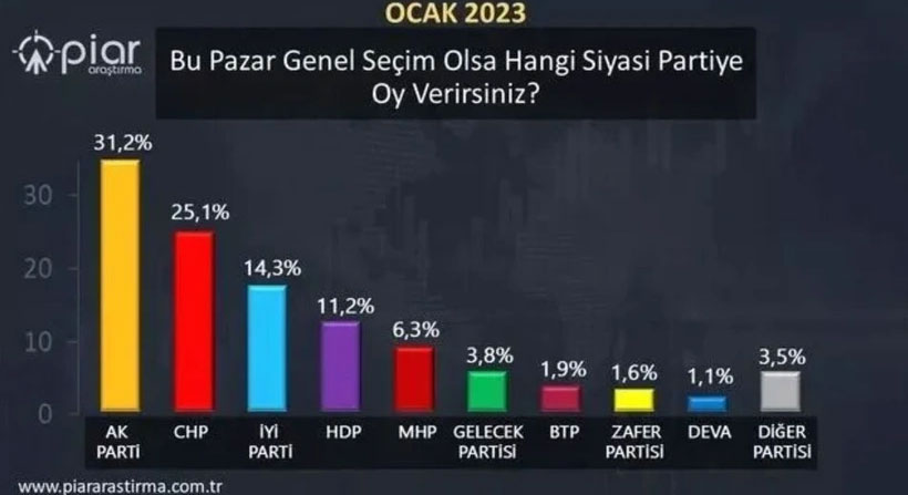 Piar Araştırma, 79 Ocak tarihleri arasında 26 ilde 2 bin 611 katılımcı ile gerçekleştirdiği son anketinin sonuçlarını paylaştı. Şirketin bir önceki ayki yoklamasına göre 5 partinin oy kaybettiği ankette; AKP, İYİ Parti ve HDP oylarını artırdı.