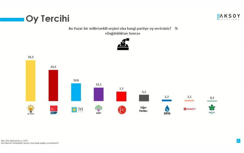 Ankete göre AKP'nin oy oranı yüzde 33,3 olurken, CHP'nin oy oranı ise yüzde 25,5 olarak ölçüldü.